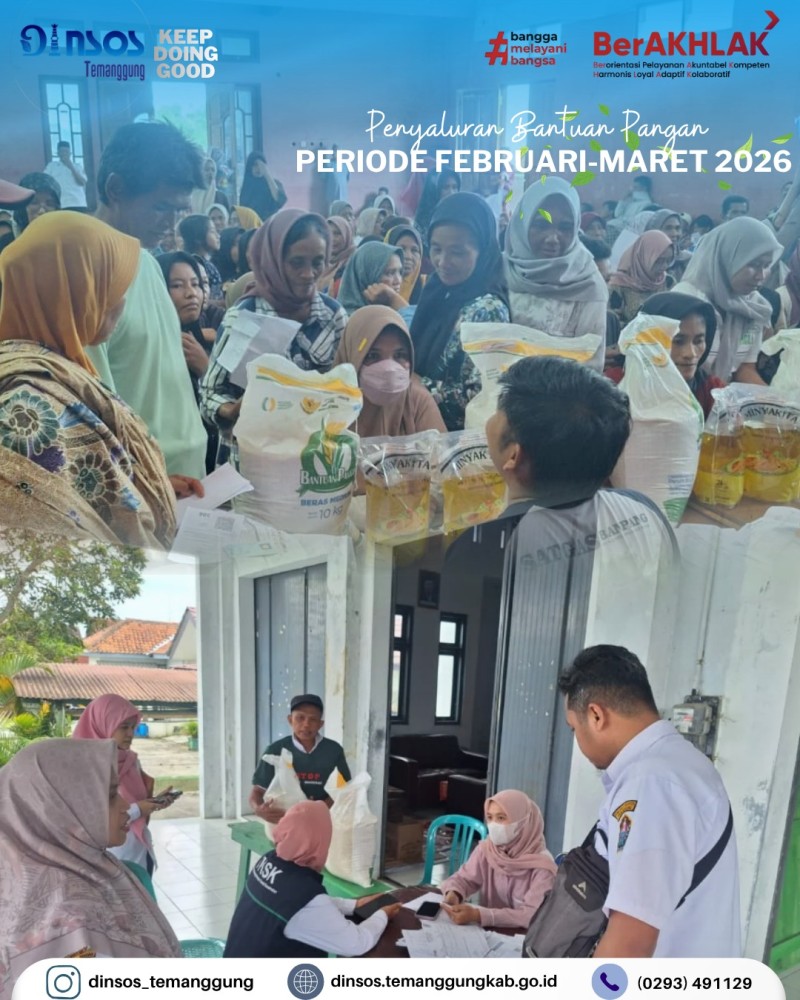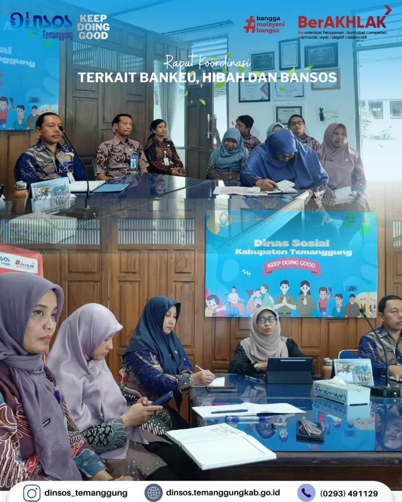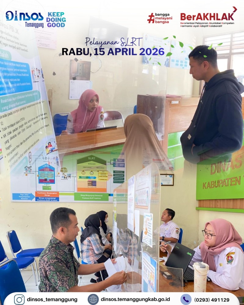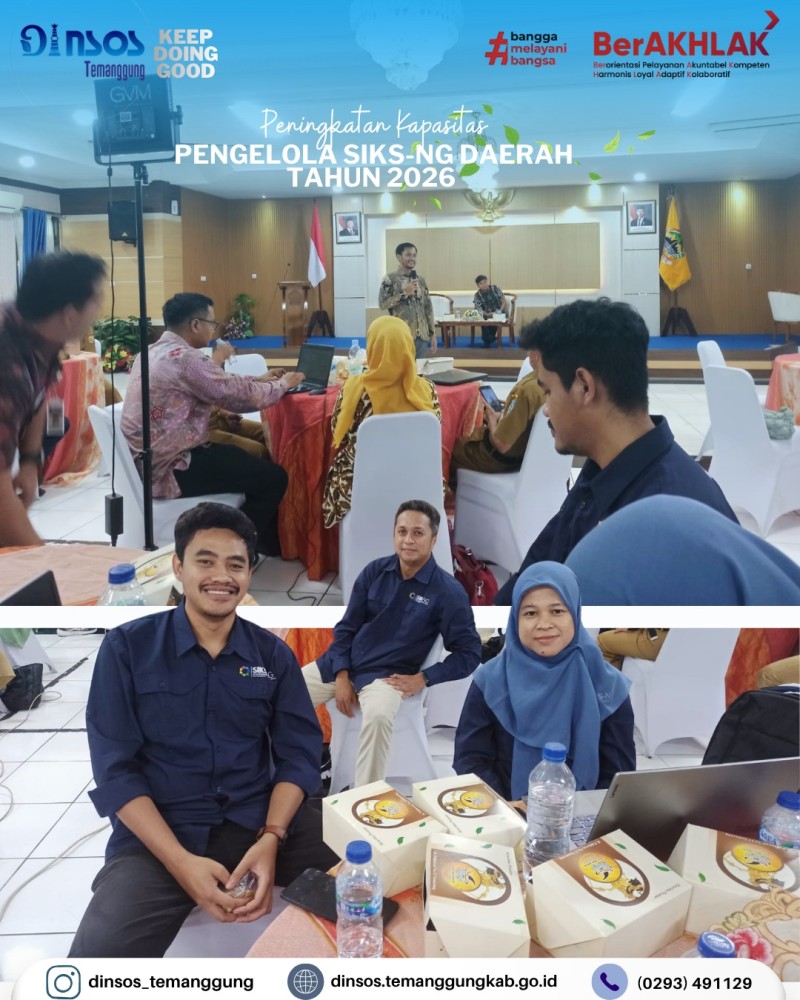 Berita Kategori: Smart Government (Pemerintah Cerdas) Sekretariat Jumat, 17/04/2026 14:25 1 Kepala Dinas Sosial mengikuti rapat lewat zoom meeting Evaluasi ground check PBI tahap II Selengkapnya Kategori: Smart Government (Pemerintah Cerdas) Sekretariat Jumat, 17/04/2026 14:18 1 Dinas Sosial mengucapkan Selamat dan sukses atas dilantiknya Bapak Chairul Adyanto, S.Psi, M.M sebagai Sekretaris Kecamatan Pringsurat Selengkapnya Kategori: Smart Government (Pemerintah Cerdas) Sekretariat Jumat, 17/04/2026 14:15 1 Dinas Sosial mengikuti pembukaan Pagelaran Nasional, syawalan pusaka 2026 Selengkapnya Kategori: Smart Government (Pemerintah Cerdas) Sekretariat Jumat, 17/04/2026 14:08 0 Dinas Sosial mengucapkan terima kasih dan melepas peserta magang siswi SMKN 5 Kendal Selengkapnya Kategori: Smart Government (Pemerintah Cerdas) Sekretariat Kamis, 16/04/2026 15:13 0 Dinas Sosial mengadakan rapat koordinasi terkait bankeu, hibah dan bansos Selengkapnya Kategori: Smart Government (Pemerintah Cerdas) Sekretariat Kamis, 16/04/2026 14:51 2 Dinas Sosial mengikuti desk dan review dokumen evaluasi penyelenggaraan Kabupaten Layak Anak Selengkapnya Kategori: Smart Government (Pemerintah Cerdas) Bidang Perlindungan dan Jaminan Sosial Kamis, 16/04/2026 08:42 0 Dinas Sosial mengikuti Kegiatan Peningkatan Kapasitas pengelola SIKS-NG Daerah Tahun 2026 Selengkapnya Kategori: Smart Government (Pemerintah Cerdas) UPT Kamis, 16/04/2026 08:32 0 Dinas Sosial melakukan pendampingan reunifikasi klien SR ke Kabupaten Banjarnegara Selengkapnya Kategori: Smart Government (Pemerintah Cerdas) Bidang Perlindungan dan Jaminan Sosial Rabu, 15/04/2026 14:36 0 Dinas Sosial melaksanakan monitoring penyaluran bantuan pangan Selengkapnya Kategori: Smart Government (Pemerintah Cerdas) Sekretariat Rabu, 15/04/2026 13:21 0 Dinas Sosial memenuhi undangan dari Camat Temanggung dalam acara rapat koordinasi dan evaluasi bidang kesehatan Selengkapnya Kategori: Smart Government (Pemerintah Cerdas) Sekretariat Rabu, 15/04/2026 10:39 0 Dinas Sosial melakukan layanan SLRT Selengkapnya Kategori: Smart Government (Pemerintah Cerdas) Sekretariat Rabu, 15/04/2026 10:28 0 Apel pagi Dinas Sosial Selengkapnya 123NextLast