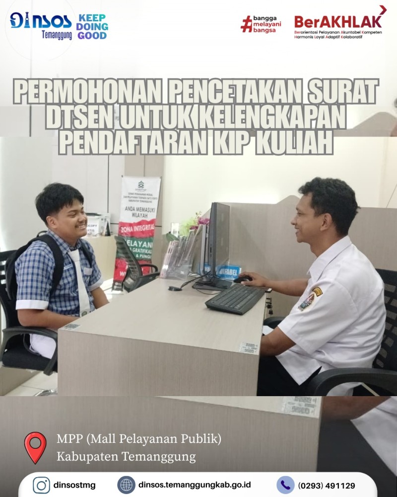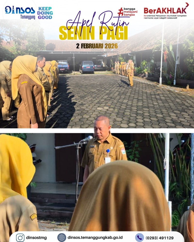 Berita Kategori: Smart Government (Pemerintah Cerdas) Sekretariat Rabu, 04/02/2026 15:24 1 Dinas Sosial Mendampingi Tim BPKP Tinjau Lokasi Sekolah Rakyat Selengkapnya Kategori: Smart Government (Pemerintah Cerdas) Bidang Rehabilitasi Sosial Rabu, 04/02/2026 14:23 2 Dinas Sosial Menghadiri Sosialisasi Pemberdayaan dan Pemenuhan Hak Penyandang Disabilitas di Bidang Ketenagakerjaan Selengkapnya Kategori: Smart Government (Pemerintah Cerdas) Sekretariat Rabu, 04/02/2026 13:28 2 Pelayanan Dinas Sosial di MPP memberikan layanan permohonan pencetakan DTSEN Selengkapnya Kategori: Smart Government (Pemerintah Cerdas) Sekretariat Rabu, 04/02/2026 13:00 0 Menerima Tamu dari BPKP Selengkapnya Kategori: Smart Government (Pemerintah Cerdas) Sekretariat Rabu, 04/02/2026 09:21 1 Dinas Sosial melaksanakan apel pagi bersama Selengkapnya Kategori: Smart Government (Pemerintah Cerdas) Sekretariat Selasa, 03/02/2026 15:18 1 Dinas Sosial Mengikuti Desk Peta Jabatan Tahun 2026 Selengkapnya Kategori: Smart Government (Pemerintah Cerdas) Sekretariat Selasa, 03/02/2026 14:56 1 TKSK Kecamatan Tembarak melakukan penanganan aduan BPJS tidak aktif Selengkapnya Kategori: Smart Government (Pemerintah Cerdas) Sekretariat Senin, 02/02/2026 15:04 1 TKSK Kecamatan Tembarak melakukan koordinasi dengan Camat Tembarak terkait kegiatan Selengkapnya Kategori: Smart Society (Masyarakat Cerdas) Sekretariat Senin, 02/02/2026 13:23 4 Dinas Sosial Menerima Kunjungan Persatuan Penyandang Disabilitas Fisik (PPDFI) Kabupaten Temanggung Selengkapnya Kategori: Smart Government (Pemerintah Cerdas) Bidang Perlindungan dan Jaminan Sosial Senin, 02/02/2026 08:53 3 Dinas Sosial memberangkatkan anggota TAGANA ke Kab. Batang Selengkapnya Kategori: Smart Government (Pemerintah Cerdas) Sekretariat Senin, 02/02/2026 08:43 3 Apel pagi Dinas Sosial Hari Senin tanggal 2 Februari 2026 Selengkapnya Kategori: Smart Government (Pemerintah Cerdas) Sekretariat Senin, 02/02/2026 08:41 1 TAGANA Kabupaten Temanggung bertugas dapur umum pada acara harlah NU ke 100 tahun di Kabupaten Batang Selengkapnya FirstPrev45678NextLast