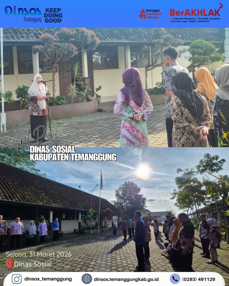 Berita Kategori: Smart Government (Pemerintah Cerdas) Bidang Perlindungan dan Jaminan Sosial Selasa, 31/03/2026 15:08 1 Pendamping Sosial Kecamatan Selopampang melaksanakan monitoring penyaluran bantuan pangan di Desa Bagusan Kecamatan Selopampang Selengkapnya Kategori: Smart Government (Pemerintah Cerdas) UPT Selasa, 31/03/2026 14:32 2 Dinas Sosial melakukan koordinasi dengan perangkat Desa Botoputih Kecamatan Tembarak terkait penanganan PPKS Selengkapnya Kategori: Smart Government (Pemerintah Cerdas) UPT Selasa, 31/03/2026 09:54 1 Sekretaris Dinas Sosial memimpin rapat internal UPTD Rumah Singgah Selengkapnya Kategori: Smart Government (Pemerintah Cerdas) Bidang Rehabilitasi Sosial Selasa, 31/03/2026 09:08 2 Kepala Dinas Sosial memimpin rapat internal Bidang Rehabilitasi Sosial Selengkapnya Kategori: Smart Government (Pemerintah Cerdas) Sekretariat Selasa, 31/03/2026 09:01 1 Dinas Sosial melaksanakan apel pagi bersama Selengkapnya Kategori: Smart Government (Pemerintah Cerdas) Bidang Perlindungan dan Jaminan Sosial Senin, 30/03/2026 16:04 3 Dinas Sosial menghadiri rapat koordinasi penyaluran Bantuan Pangan Beras dan Minyak Goreng alokasi bulan Februari dan Maret 2026 Selengkapnya Kategori: Smart Government (Pemerintah Cerdas) Sekretariat Senin, 30/03/2026 15:54 1 Dinas Sosial mengadakan rapat sharing knowledge pelaksanaan terapi disabilitas Selengkapnya Kategori: Smart Government (Pemerintah Cerdas) Sekretariat Senin, 30/03/2026 15:48 3 Sharing Knowledge Persiapan Launching Rumah Terapi Temanggung Selengkapnya Kategori: Smart Government (Pemerintah Cerdas) Sekretariat Senin, 30/03/2026 15:21 2 Kepala Dinas Sosial meninjau calon lokasi rintisan SRMA 16 Temanggung Selengkapnya Kategori: Smart Government (Pemerintah Cerdas) Bidang Perlindungan dan Jaminan Sosial Senin, 30/03/2026 13:28 1 Dinas Sosial mengadakan Pelatihan Groundchek PBI Tahap II bagi Pendamping Sosial Dinas Sosial Selengkapnya Kategori: Smart Government (Pemerintah Cerdas) Sekretariat Senin, 30/03/2026 09:46 2 Dinas Sosial mengadakan rapat intern yang dipimpin oleh Kepala Dinas Sosial Selengkapnya Kategori: Smart Government (Pemerintah Cerdas) Sekretariat Senin, 30/03/2026 09:21 2 Apel pagi Dinas Sosial Hari Senin tanggal 30 Maret 2026 Selengkapnya FirstPrev56789NextLast