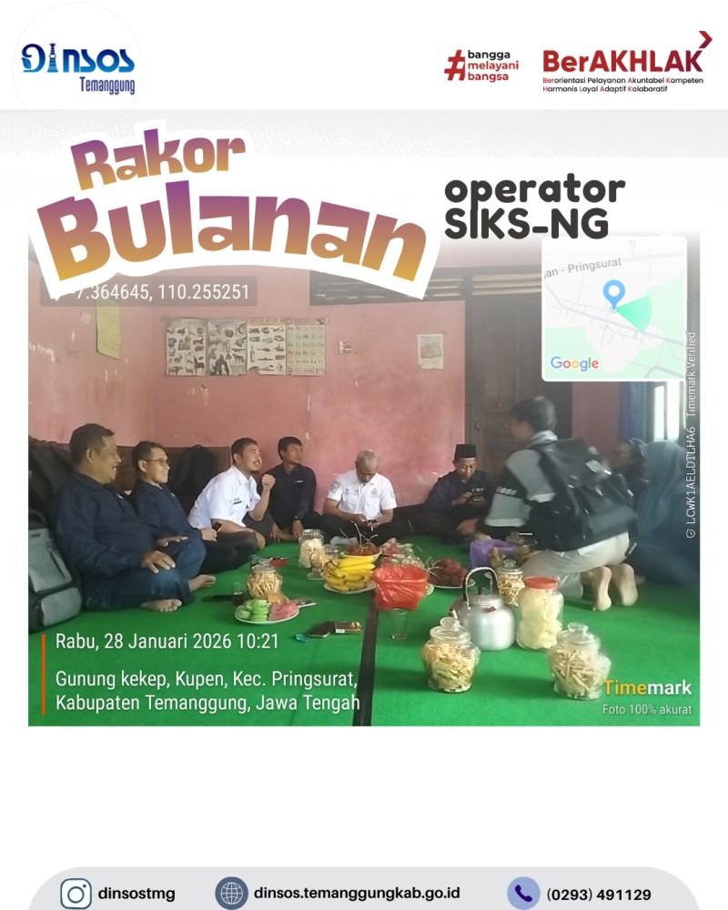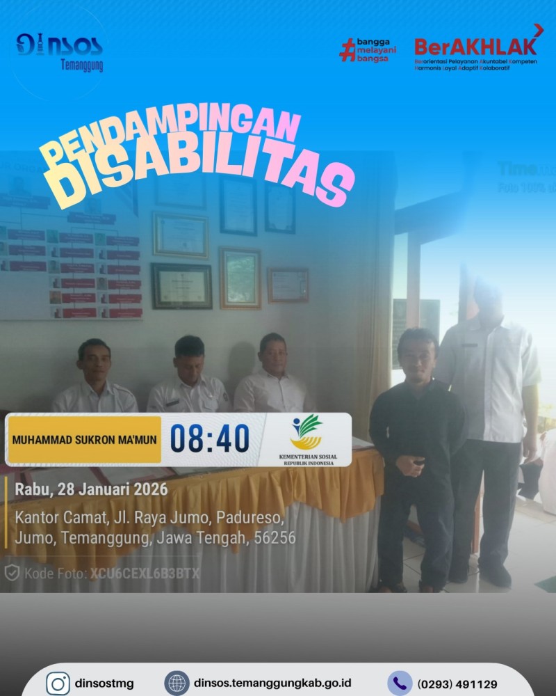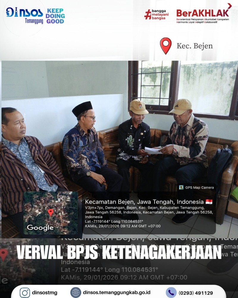 Berita Kategori: Smart Government (Pemerintah Cerdas) Sekretariat Kamis, 29/01/2026 14:51 1 TKSK Kecamatan Bejen melaksanakan desk verval BPJSTK Selengkapnya Kategori: Smart Government (Pemerintah Cerdas) Sekretariat Kamis, 29/01/2026 13:40 0 Dinas Sosial menghadiri rapat evaluasi mall pelayanan publik Tahun 2025 Selengkapnya Kategori: Smart Government (Pemerintah Cerdas) Sekretariat Kamis, 29/01/2026 11:01 2 TKSK Kecamatan Candiroto mengikuti Musrembang RKPD Tahun 2027 Selengkapnya Kategori: Smart Government (Pemerintah Cerdas) Sekretariat Kamis, 29/01/2026 10:56 0 TKSK Kecamatan Tretep melaksanakan apel pagi bersama Selengkapnya Kategori: Smart Government (Pemerintah Cerdas) Sekretariat Kamis, 29/01/2026 08:47 3 TKSK Kecamatan Bejen melaksanakan desk verifikasi CKPM BPJS TK Selengkapnya Kategori: Smart Government (Pemerintah Cerdas) Sekretariat Kamis, 29/01/2026 08:36 0 TKSK Kecamatan Jumo melakukan pendampingan disabilitas fisik dalam kegiatan Musrenbang RKPD Selengkapnya Kategori: Smart Government (Pemerintah Cerdas) UPT Kamis, 29/01/2026 08:33 1 UPTD Rumah Singgah Dinas Sosial melakukan pendampingan pemberian rujukan terhadap PPKS Selengkapnya Kategori: Smart Government (Pemerintah Cerdas) Sekretariat Kamis, 29/01/2026 08:10 2 TKSK Kecamatan Jumo melaporkan kegiatan selama Bulan Januari 2026 Selengkapnya Kategori: Smart Government (Pemerintah Cerdas) Sekretariat Kamis, 29/01/2026 08:04 0 TKSK Kecamatan Pringsurat mengadakan rakor bulanan operator Siks-NG Selengkapnya Kategori: Smart Government (Pemerintah Cerdas) Sekretariat Rabu, 28/01/2026 15:48 0 TKSK Kecamatan Tembarak melakukan asesmen kepada klien yang membutuhkan pelayanan sosial Selengkapnya Kategori: Smart Government (Pemerintah Cerdas) Sekretariat Rabu, 28/01/2026 14:13 0 TKSK Kecamatan Kandangan melakukan sosialisasi bansos sembako di Dusun Tegesan Desa Samiranan Selengkapnya Kategori: Smart Government (Pemerintah Cerdas) Bidang Rehabilitasi Sosial Rabu, 28/01/2026 11:40 0 Musrenbang RKPD Selengkapnya FirstPrev678910NextLast