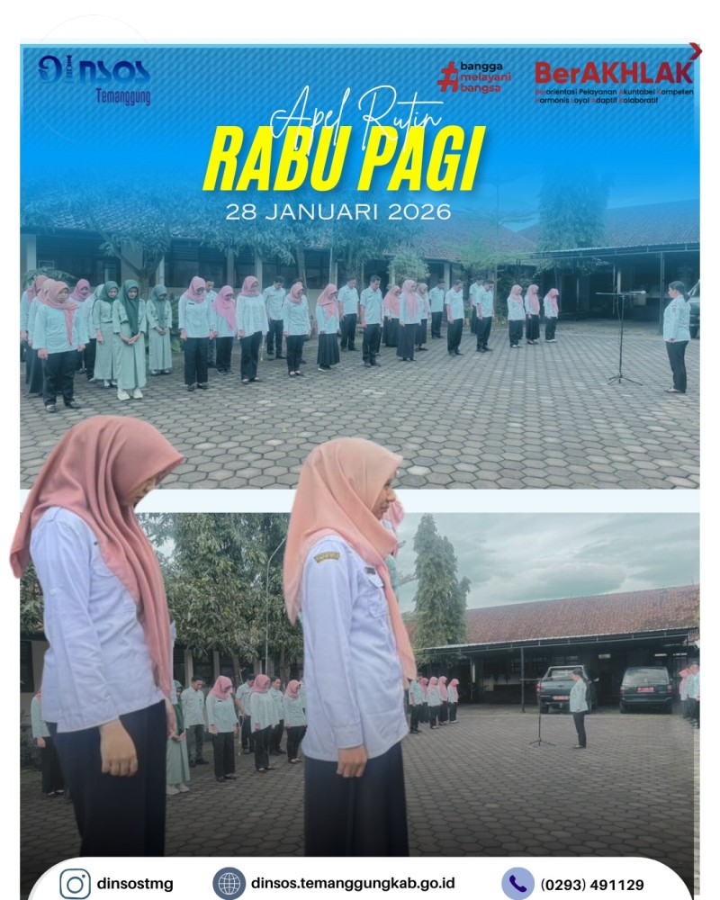 Berita Kategori: Smart Government (Pemerintah Cerdas) Sekretariat Kamis, 29/01/2026 08:10 2 TKSK Kecamatan Jumo melaporkan kegiatan selama Bulan Januari 2026 Selengkapnya Kategori: Smart Government (Pemerintah Cerdas) Sekretariat Kamis, 29/01/2026 08:04 0 TKSK Kecamatan Pringsurat mengadakan rakor bulanan operator Siks-NG Selengkapnya Kategori: Smart Government (Pemerintah Cerdas) Sekretariat Rabu, 28/01/2026 15:48 0 TKSK Kecamatan Tembarak melakukan asesmen kepada klien yang membutuhkan pelayanan sosial Selengkapnya Kategori: Smart Government (Pemerintah Cerdas) Sekretariat Rabu, 28/01/2026 14:13 0 TKSK Kecamatan Kandangan melakukan sosialisasi bansos sembako di Dusun Tegesan Desa Samiranan Selengkapnya Kategori: Smart Government (Pemerintah Cerdas) Bidang Rehabilitasi Sosial Rabu, 28/01/2026 11:40 0 Musrenbang RKPD Selengkapnya Kategori: Smart Government (Pemerintah Cerdas) UPT Rabu, 28/01/2026 09:53 3 Pendampingan Pengiriman Klien ke Panti Pelayanan Sosial PGOT Selengkapnya Kategori: Smart Government (Pemerintah Cerdas) Sekretariat Rabu, 28/01/2026 09:34 5 DINAS SOSIAL MELAKSANAKAN APEL PAGI BERSAMA Selengkapnya Kategori: Smart Government (Pemerintah Cerdas) Sekretariat Selasa, 27/01/2026 15:47 1 TKSK Kecamatan Bulu menerima aduan dari warga yang tidak menerima bansos Selengkapnya Kategori: Smart Government (Pemerintah Cerdas) Sekretariat Selasa, 27/01/2026 14:38 0 TKSK Kecamatan Wonoboyo menerima pengumpulan BA, SPTJM Selengkapnya Kategori: Smart Government (Pemerintah Cerdas) Sekretariat Selasa, 27/01/2026 13:58 4 Dinas Sosial menghadiri Penyusunan Laporan kinerja Instansi Pemerintah (LKJiP) Tahun 2025 Selengkapnya Kategori: Smart Government (Pemerintah Cerdas) Sekretariat Selasa, 27/01/2026 13:54 1 TKSK Kecamatan Temanggung mengikuti Musrebang RKPD Tahun 2027 Selengkapnya Kategori: Smart Government (Pemerintah Cerdas) Sekretariat Selasa, 27/01/2026 12:20 4 EVALUASI SATPAM DINAS SOSIAL KABUPATEN TEMANGGUNG Selengkapnya FirstPrev7891011NextLast