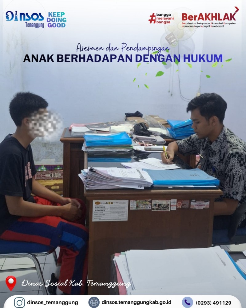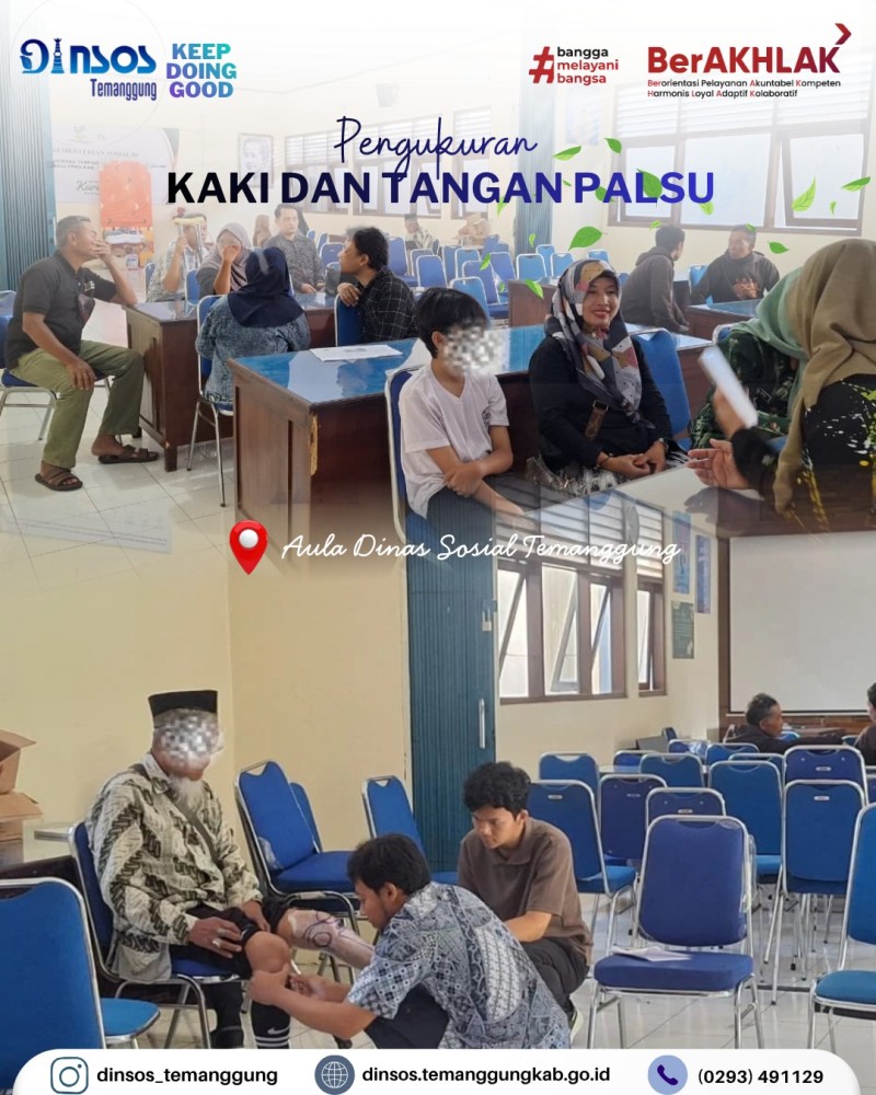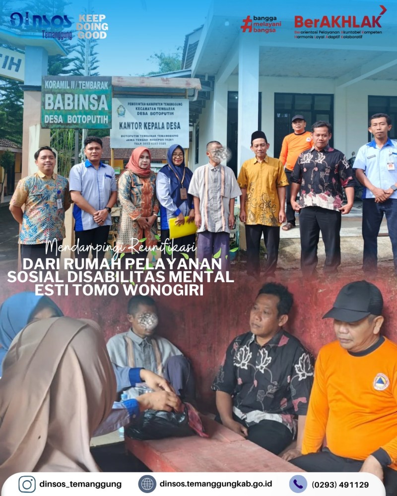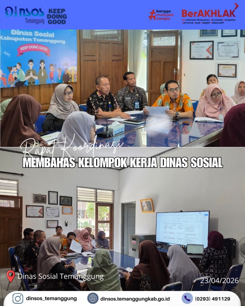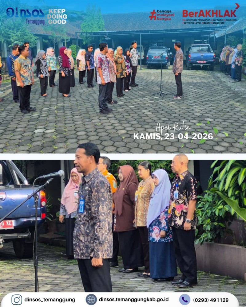 Kategori Lainnya Kategori: Smart Government (Pemerintah Cerdas) , Lainnya 23 April 2026 14:44:00 1 Dinas Sosial telah melaksanakan pendamping reunfikasi dari Rumah Pelayanan Sosial Disabilitas Mental Esti Tomo Wonogiri Selengkapnya Kategori: Smart Government (Pemerintah Cerdas) , Lainnya 23 April 2026 14:05:00 1 Dinas Sosial memfasilitasi pengukuran kaki palsu dan tangan palsu bagi penyandang disabilitas Selengkapnya Kategori: Smart Society (Masyarakat Cerdas) , Lainnya 23 April 2026 13:53:00 0 Dinas Sosial melakukan asesmen dan pendampingan anak berhadapan dengan hukum (ABH) Selengkapnya Kategori: Smart Government (Pemerintah Cerdas) , Lainnya 23 April 2026 10:51:00 1 Rapat Koordinasi Internal Dinas Sosial Kabupaten Temanggung membahas kelompok kerja Dinsos Selengkapnya Kategori: Smart Government (Pemerintah Cerdas) , Lainnya 23 April 2026 10:35:00 0 Dinas Sosial melaksanakan apel pagi Selengkapnya Kategori: Smart Government (Pemerintah Cerdas) , Lainnya 22 April 2026 13:31:00 1 Dinas Sosial mengikuti Desk IKPD dan Data Pokok Selengkapnya Kategori: Smart Government (Pemerintah Cerdas) , Lainnya 21 April 2026 14:50:00 1 UPTD Rumah Singgah menerima kunjungan dari Dinas Sosial Kota Tegal dalam rangka penjemputan PPKS terlantar di Temanggung Selengkapnya Kategori: Smart Government (Pemerintah Cerdas) , Lainnya 21 April 2026 11:11:00 1 Apel Luar Biasa Peringatan Hari Kartini 21 April 2026 Dinas Sosial Selengkapnya Kategori: Smart Government (Pemerintah Cerdas) , Lainnya 21 April 2026 09:15:00 1 Dinas Sosial Kabupaten Temanggung bersama Taruna Siaga Bencana (TAGANA) Temanggung melakukan kegiatan penanggulangan bencana hunian tersambar petir Selengkapnya Kategori: Smart Government (Pemerintah Cerdas) , Lainnya 20 April 2026 16:08:00 2 Dinas Sosial mengikuti desk dan monev UCJ BPJSTK oleh Biro Bangda Kemendagri Selengkapnya Kategori: Smart Government (Pemerintah Cerdas) , Lainnya 20 April 2026 16:05:00 1 Kegiatan monitoring di rumah singgah Yogyakarta Selengkapnya Kategori: Smart Government (Pemerintah Cerdas) , Lainnya 20 April 2026 14:11:00 1 Monev Penyaluran Bantuan Pangan oleh Kepala Dinas Sosial di Kecamatan Bulu Selengkapnya 123NextLast