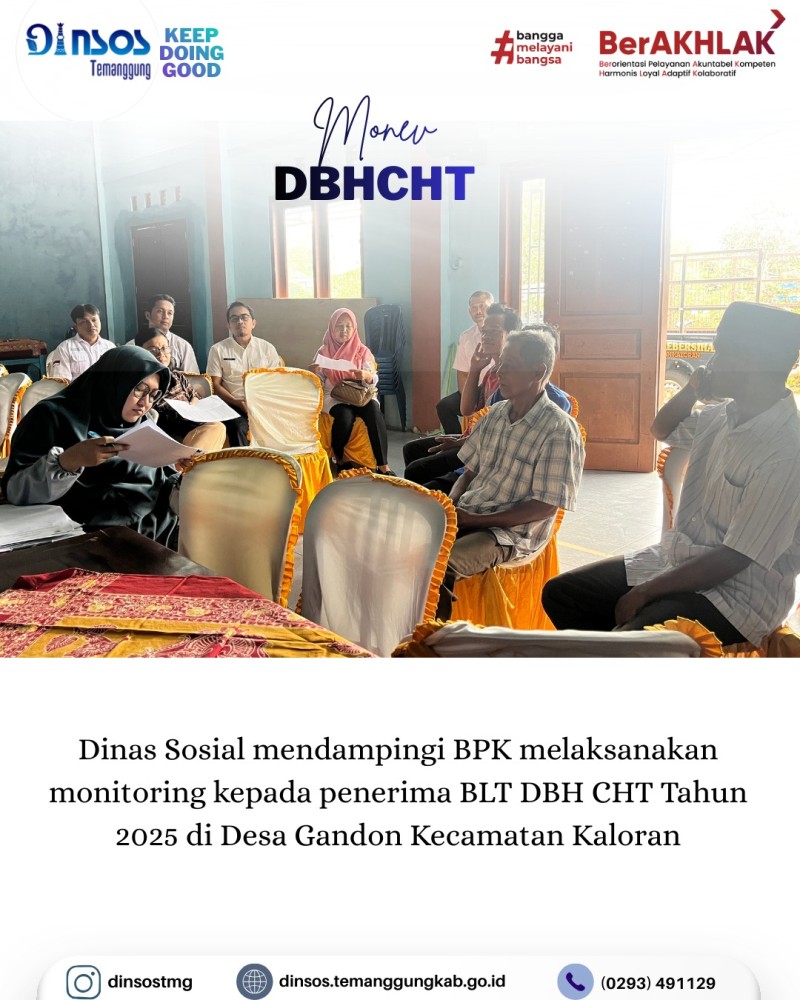 Kategori DBHCHT (Cukai Tembakau) Kategori: Smart Government (Pemerintah Cerdas) , DBHCHT (Cukai Tembakau) 07 April 2026 09:04:00 2 Pendamping Sosial Kecamatan Selopampang melaksanakan monitoring penyaluran bantuan pangan di Desa Kacepit Kecamatan Selopampang Selengkapnya Kategori: Smart Government (Pemerintah Cerdas) , DBHCHT (Cukai Tembakau) 04 Maret 2026 14:28:00 3 Dinas Sosial mendampingi BPK ( Badan Pemeriksa Keuangan) melaksanakan monitoring kepada penerima BLT DBH CHT Tahun 2025 Selengkapnya Kategori: Smart Government (Pemerintah Cerdas) , DBHCHT (Cukai Tembakau) 10 Februari 2026 14:31:00 6 Dinas Sosial menghadiri rapat persiapan desk evaluasi laporan semester 2 kegiatan DBHCHT Tahun Anggaran 2025 Selengkapnya 123NextLast