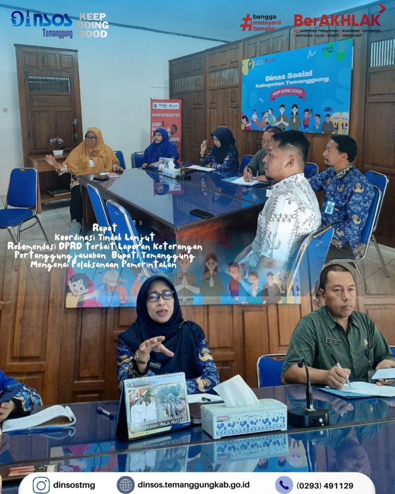Selasa, 17 Maret 2026 Dinas Sosial melaksanakan rapat koordinasi sebagai tindak lanjut rekomendasi DPRD Kabupaten Temanggung terkait laporan pertanggungjawaban Bupati Temanggung mengenai pelaksanaan pemerintahan khususnya bidang sosial.