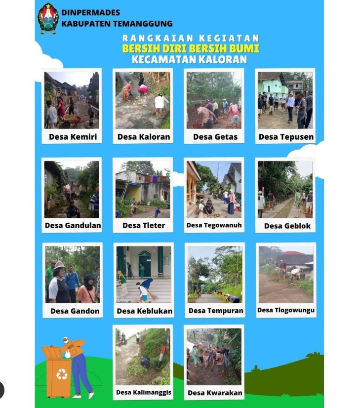 Kepala Dinpermades Temanggung Gema Artisti W, telah membagi tugas kepada semua karyawan Dinpermades Temanggung untuk melakukan pemantauan dalam kegiatan BERSIH DIRI dan BERSIH BUMI di beberapa desa di Kecamatan Kaloran, antara lain: Desa Kemiri, Desa Kaloran, Desa Getas, Desa Tepusen, Desa Gandulan, Desa Tleter, Desa Tegowanuh, Desa Geblok, Desa Gandon, Desa Keblukan, Desa Tempuran, Tlogowungu, Desa Kalimanggis, dan Desa Kwarakan.