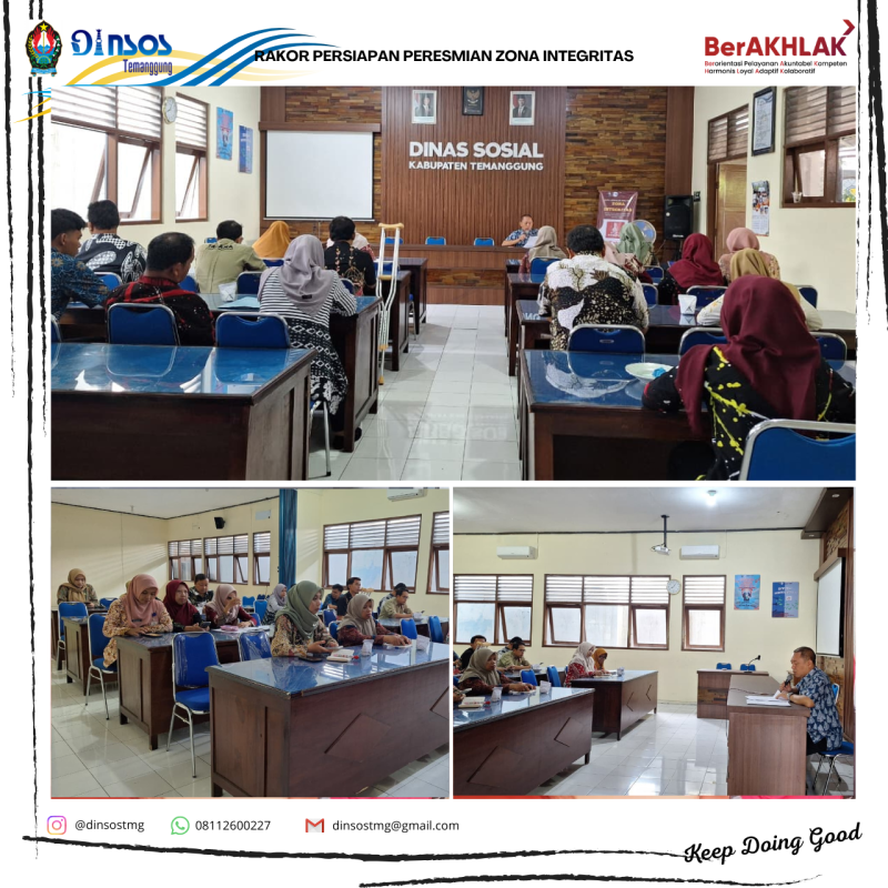 Rapat Koordinasi dalam rangka persiapan launcing zona integritas Dinas Sosial yang bertempat di aula Dinas Sosial. Rapat dipimpin oleh Sekretaris Dinas Sosial diikuti oleh semua perwakilan bidang dan sekretariat.