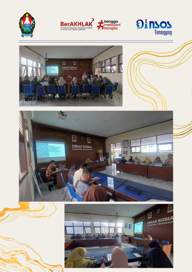Hari Kamis, 18 Desember 2025 Dinas Sosial mengadakan Rapat Koordinasi Kinerja Triwulan IV di Aula Dinas Sosial, yang dihadiri oleh perwakilan dari setiap bidang. Rapat dipimpin oleh Sekretaris Dinas Sosial. Rapat membahas capaian IKPD dan Data Pokok Triwulan IV Tahun 2025, CHE Evaluasi RR Dinsos 2026 serta capaian SPM Bidang Sosial Triwulan IV 2025.