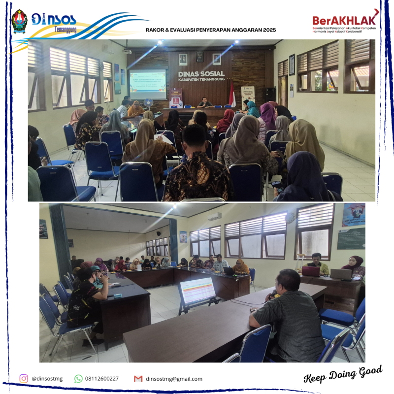 Hari Kamis, tanggal 8 Januari 2025 Dinas Sosial mengadakan rapat koordinasi dan evaluasi penyerapan anggaran tahun 2025 yang dipimpin oleh Tomi Adi Purnomo, S.Sos, M.AP, M.Sc (Sekretaris Dinas Sosial). Kegiatan ini dilakukan untuk membahas permasalahan pada kegiatan-kegiatan yang capaian realisasinya kurang dari 70% serta langkah-langkah yang sebaiknya dilakukan di tahun berikutnya.