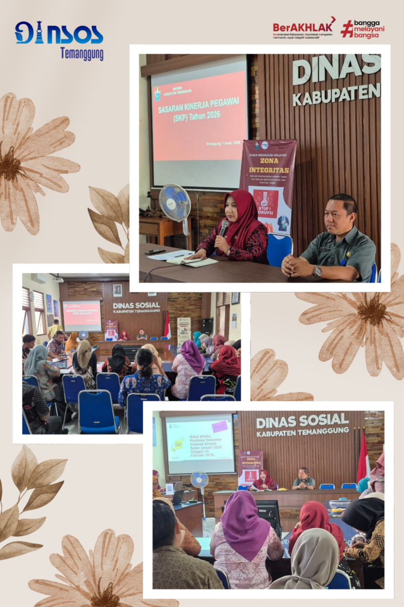 Pada hari Kamis 8 Januari 2025, Dinas Sosial mengadakan Sosialisasi Pelaksanaan Pemberian Tambahan Penghasilan Pegawai Aparatur Sipil Negara di Lingkungan Pemerintah Kabupaten Temanggung Tahun 2026 dan tata cara pengisian SKP Tahun 2026. Kebijakan TPP tahun ini berbeda dari tahun sebelumnya. Landasan dari kebijakan TPP ini adalah Keputusan Menteri Dalam Negeri Nomor 900.1.3.2-1287 tahun 2024 tentang Tata Cara Persetujuan Menteri Dalam Negeri Terhadap Pemberian Tambahan Penghasilan Pegawai Aparatur Sipil Negara di Pemerintah Daerah. Kebijakan ini bertujuan untuk meningkatkan efektivitas manajemen kinerja ASN, memastikan kesesuaian pemberian TPP dengan ketentuan Kemendagri, memperkuat akuntabilitas pengelolaan keuangan daerah, serta mendorong budaya kerja yang profesional dan berorientasi hasil. Sosialisasi ini dipimpin oleh Kasubbag Umum dan Kepegawaian Dinas Sosial Kabupaten Temanggung.